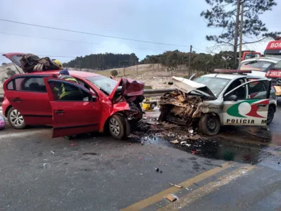 Segundo a PM, o acidente aconteceu por volta das 7h da manhã, na SC-390, em Anita Garibaldi. Um veículo Gol, saiu da pista e bateu contra a viatura policial.