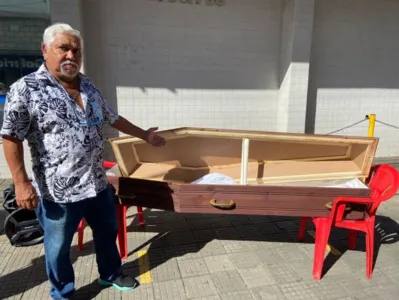 Homem coloca caixão e protesta na frente do INSS após perder benefício