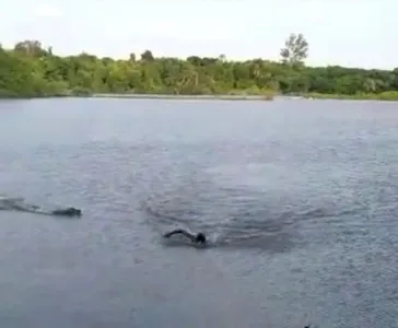 Homem nada em lago proibido para banho e acaba sendo atacado