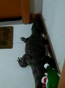 Jacaré invade prédio e é flagrado em porta de apartamento