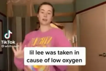 No vídeo, a mulher fala sobre o estado de saúde do filho. Ela aparece beijando a cabeça do bebê e fazendo um símbolo de coração com as mãos. Na sequência, dança alegremente enquanto o seguinte texto aparece: “O pequeno Lee foi internado porque está com falta de oxigênio. Ele testou positivo para VSR. Estamos esperando que ele consiga respirar melhor por conta própria”.