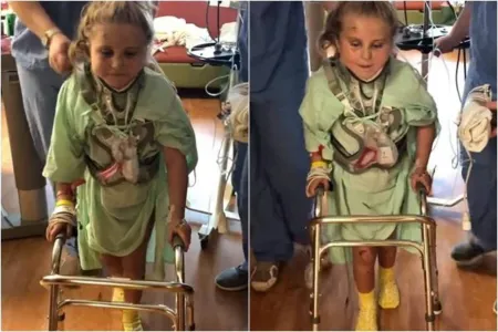 Com o auxílio de um andador e um colete ortopédico, Avalinn Rackley começou a dar os primeiros passos na quinta-feira (16), muito sorridente.