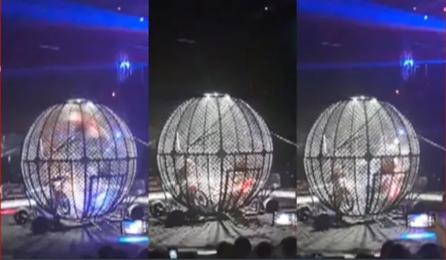 Motociclistas de 'globo da morte' ficam feridos após se chocarem; veja