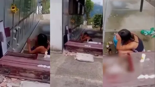 Conforme apurado, a mulher teria aberto o túmulo com a intenção de dar um banho no corpo e trocar as roupas do falecido. Nas imagens, é possível ver também garrafas de cerveja e uma vela posicionadas próximas ao caixão.