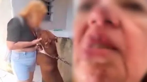 Uma segunda mulher que estava no local filmou o momento do ataque. No vídeo, a vítima aprece beijando a boca do cachorro que está preso por uma corrente.
