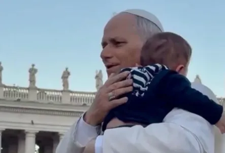 Papa Leão XIV abraça bebê brasileiro durante cerimônia no Vaticano