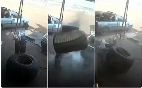 As imagens mostram os instantes anteriores e o momento em que o pneu estoura. Welington e os demais funcionários que estavam próximos escaparam ilesos.