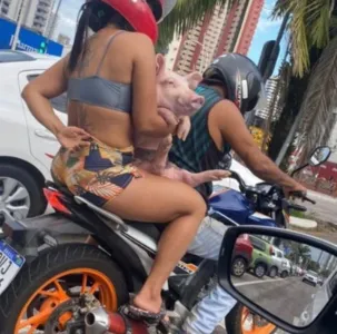 Momentos depois, a cena curiosa foi parar na web. Na imagem é possível notar que o porco está no colo de uma mulher que viajava de carona na moto.