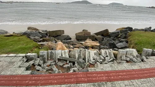 A força da ressaca marítima provocou destruição em trechos da Orla da Enseada, em São Francisco do Sul, Santa Catarina, durante a madrugada desta terça-feira (07). O avanço do mar atingiu o novo calçadão, derrubou um poste e levou parte da terra que sustentava árvores, deixando as raízes expostas. Os tijolos que compõem a estrutura também foram arrancados e espalhados pela areia.
