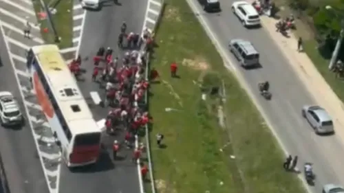 Integrantes da torcida do Santos iniciaram um ataque a um dos ônibus que transportava torcedores do Internacional