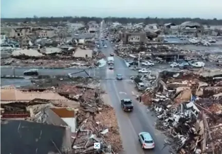 Vídeos e fotos postados nas redes sociais, mas que ainda não foram autenticados pela Reuters, mostram edifícios no centro de Mayfield reduzidos a escombros, com carros quase que totalmente soterrados.