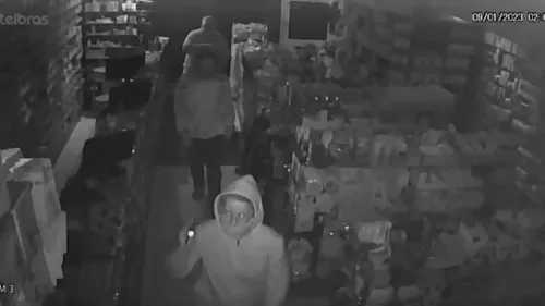 O momento do crime foi flagrado por câmeras de segurança. Nas imagens é possível ver uma mulher e dois homens, todos idosos, entrando no estabelecimento e utilizando lanternas para ajudar no furto.