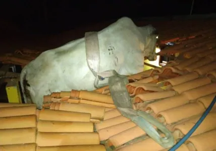 Vaca fica presa em telhado e é resgatada pelos bombeiros