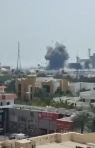 Um dos alvos foi a base da US Fifth Fleet, localizada no Bahrein. Imagens divulgadas mostram uma coluna de fumaça na direção da instalação naval após os impactos.