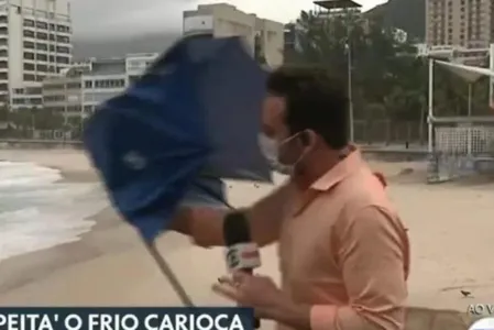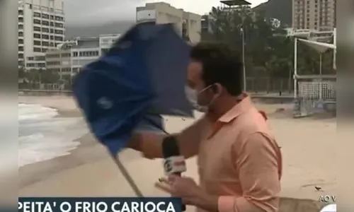 Nesta terça-feira (29), um repórter passou dificuldades durante uma transmissão ao vivo, no Rio de Janeiro. O repórter Diego Haidar, da TV Globo, teve problemas com o guarda-chuva durante a chegada de uma frente fria. Foram registradas rajadas de vento de até 60 km/h.