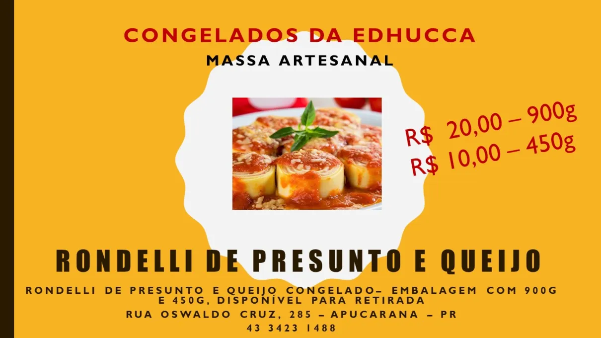A Escola de Desenvolvimento Humano Casa do Caminho (Edhucca), de Apucarana, trabalha no preparo de pratos congelados. Para esta semana, os voluntários prepararam lasanha à bolonhesa, que podem ser adquiridas em embalagens de 900 e 450 gramas. Os valores são R$ 20 e R$ 10 respectivamente.
