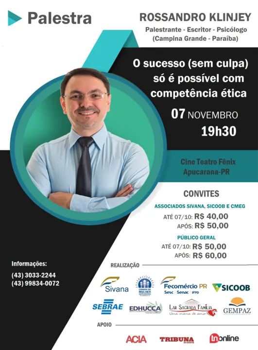 O fenômeno das redes sociais, Rossandro Klinjey virá a Apucarana para ministrar a palestra "O sucesso (sem culpa) só é possível com competência ética". O encontro com o palestrante, escritor, psicólogo clínico e mestre em saúde coletiva será no dia 7 de novembro, às 19h30, no Cine Teatro Fênix.