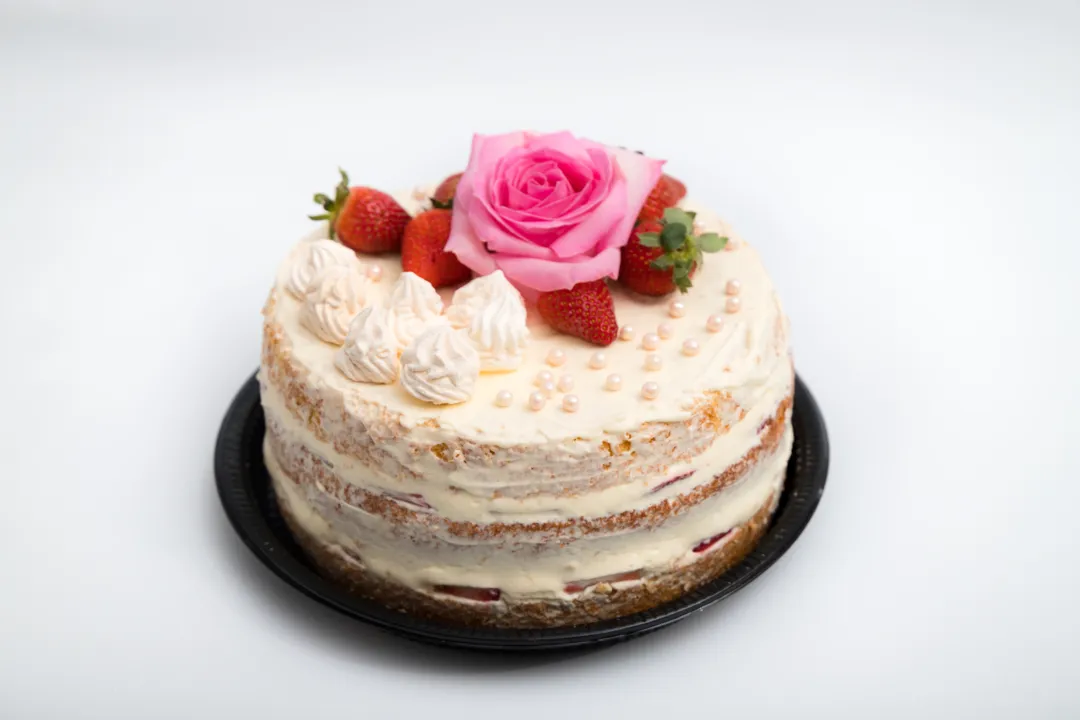 Bolo de baunilha com três camadas de creme de leite, com leite condensado, morangos frescos e suspiros. R$ 24,90/Kg