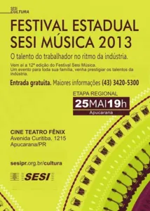 Neste sábado (25/05), às 19 horas, no Cine Teatro Fênix, os candidatos do Festival Estadual Sesi Música 2013 da região Norte do Estado, mostram seu talento na etapa classificatória em Apucarana. O festival é destinado para trabalhadores das indústrias e tem como objetivo promover a cultura entre os industriários e seus dependentes, além de valorizar, fomentar e difundir a produção musical do país.