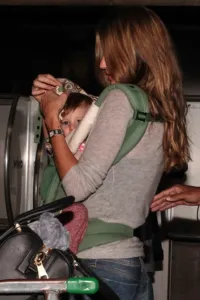Gisele Bündchen desembarcou no aeroporto de Guarulhos, em São Paulo, na manhã desta terça-feira, 10. A top, que está no país para participar de dois eventos, estava com a caçula, Vivian, e usou um pano para esconder o rostinho da menina, que estava em um canguru, sentada de frente para a mãe.