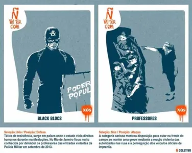 O primeiro pacote tem a imagem da professora Lenita Oliveira, que enfrentou PMs em ato na Câmara Municipal (o episódio foi registrado pelo fotógrafo Fábio Motta, do Estado) e black blocs. Eles integram o time "nós". Os adversários ("eles") têm como técnico Eduardo Cabral (referência ao prefeito Eduardo Paes e ao ex-governador Sérgio Cabral) e um guarda que destruiu donativos para os moradores tirados da Favela da Telerj, em abril.