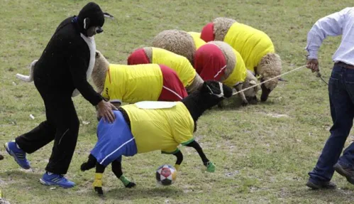A cidade colombiana de Nobsa promoveu no domingo (1) um jogo de futebol entre ovelhas. Os animais usaram os uniformes do Brasil e da Colômbia, em partida que fez parte do Dia Internacional do Poncho, comemorado anualmente nesta região colombiana, onde artesãos locais fazem ponchos de lã de ovelha, utilizando técnicas ancestrais.