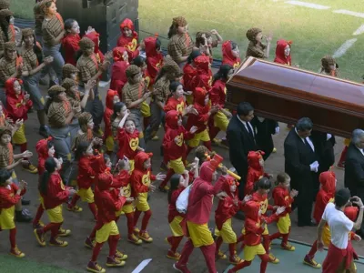 Caixão com corpo de Roberto Bolaños chega ao estádio Azteca rodeado de pessoas vestidas de 'Cahpolin'.