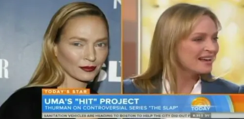 Uma Thurman esteve nesta quinta-feira (12) no programa Today, da rede americana NBC, e comentou a polêmica em torno do seu visual na pré-estreia da série "The Slap". "Que estranho todo esse falatório sobre mim. Acho que ninguém gostou da minha maquiagem."