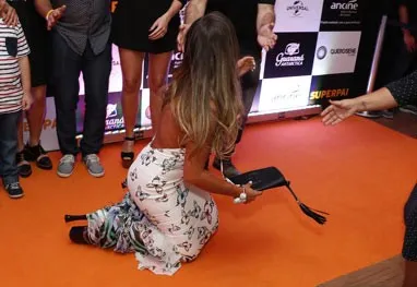Nicole Bahls cai após tropeçar no vestido, em sessão de cinema