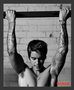 Bieber pousou em tronco nu e coberto de tatuagens para a capa da Men's Health norte-americana. A revista sai em Abril, mas o resultado já é conhecido. Na entrevista, o ex-namorado de Selena Gomez, falou sobre o seu comportamento no passado, a falta de maturidade, o seu corpo e ainda sobre da admiração que sente pelo actor Ben Affleck – “tem uma boa vibe”, diz. O cantor canadiano admite que há parte dele que “não quer crescer”. Fala do seu comportamento declarando que este ano deu "uma volta de 180º graus". "O ano passado, por esta altura, estive na prisão”, recorda. Na sessão fotográfica a preto e branco, a estrela pop confessa-se orgulhosa do seu corpo tonificado. “Estou a ficar maior, há roupa onde os meus ombros já não cabem”, confessa. Num vídeo gravado nos bastidores da produção fotográfica e depois da polémica do anúncio da Calvin Klein, Justin Bieber sublinha que nesta produção as fotografias não foram manipuladas por Photoshop. A revista masculina escolheu Bieber para a capa porque o tema é a reinvenção. Bill Philips, editor da Men's Health, justificou a decisão no editorial, explicando que “somos todos um trabalho em progresso”.