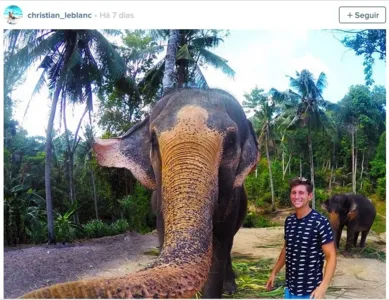 Você já viu selfie da sua tia, do colega de trabalho e da Kim Kardashian. Mas uma selfie tirada por um elefante é a primeira vez. Na semana passada, o mochileiro canadense Christian LeBlanc postou no Instagram uma selfie tirada em um parque da Tailândia, aparentemente “clicada” pela tromba do elefante.
