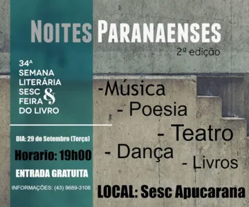 O Sesc de Apucarana realiza nesta terça (29) a segunda edição do Sarau Noites Paranaenses. Artistas de toda a região devem marcar presença no evento que faz parte da 34ª Semana Literária do Sesc Paraná.
