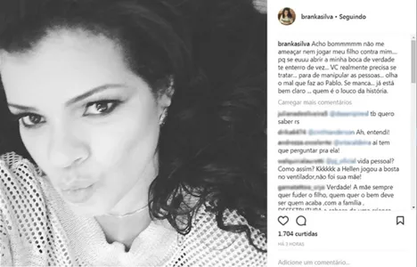 Em meio às centenas de comentários que o post recebeu, um deles se destacou: era Pablo Jorge, o filho de 19 anos de Branka e Naldo. "Vocês podem falar o que for, quem passa sou eu, vocês deveriam se preocupar com a família de vocês, é por essas e outras que minha mãe perdeu de vez o crédito comigo, é minha mãe, eu respeito, mas ela só quer me fuder, então tomem conta da vida de vocês, não façam como minha mãe, rede social nãe é vida pessoal", disparou o jovem, que, assim como o pai, se dedica à música.