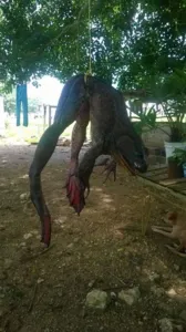 A foto de uma criatura bizarra está circulando nas redes sociais. Junto com a imagem, estão informações de que a suposta rã com mais de 100 quilos teria sido capturada no Rio Paraguai, no Porto Murtinho, no Mato Grosso do Sul. O suposto animal ainda teria sido encaminhado à capital Assunção para estudos científicos.