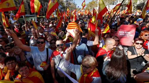 Milhares de pessoas se manifestam hoje (29) no centro de Barcelona contra a declaração de independência promovida sexta-feira passada pelo parlamento da Catalunha e a favor da unidade da Espanha.