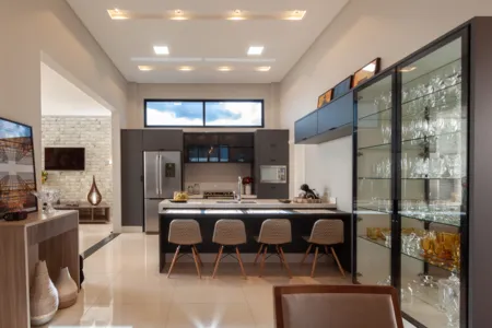 Esta casa projetada pelo arquiteto Rômulo Garcia possui espaços integrados que, além de darem uma maior sensação de amplitude aos ambientes, permitem uma interação tanto para quem reside na casa quanto para convidados. Várias atividades podem ser feitas em conjunto, como cozinhar e assistir TV e ao mesmo tempo conversar com amigos sentados à mesa.