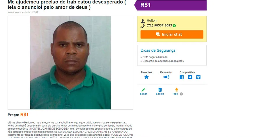 Sem conseguir um emprego fixo a sete anos, Helton de Souza Ladeira, 40 anos, desesperado para conseguir um trabalho colocou um apelo em um site de anúncios.