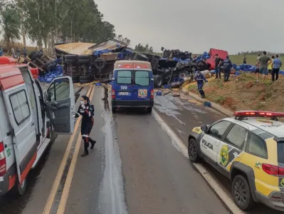 Um acidente grave, envolvendo dois caminhões e um carro, foi registrado na BR-376, em Nova Londrina, Paraná, na manhã desta sexta-feira (1). Equipes de resgate e da polícia estiveram no local.