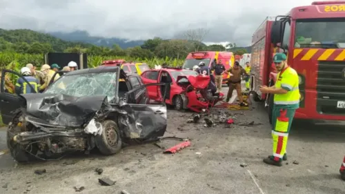 A batida lateral envolveu um Ford Fiesta preto e um Fiat Argo. Dentre as três vítimas graves, duas foram levadas ao Hospital Regional do Litoral. A terceira foi encaminhada pelo Batalhão de Polícia Militar de Operações Aéreas (BPMOA) para Curitiba.