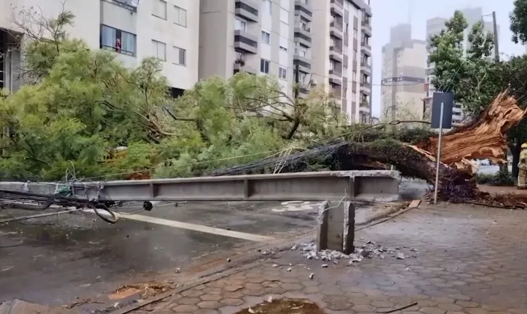 A árvore cedeu pela base, e o tronco rachou ao meio, enroscando-se na fiação da rede elétrica, derrubando um poste e danificando outro.