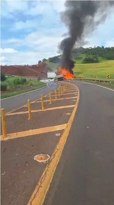 Batida entre caminhões provoca incêndio e interdição total da PR-445 entre Tamarana e Londrina