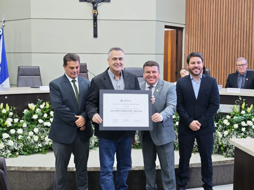 A cerimônia reuniu autoridades locais e estaduais, entre elas o prefeito Denilson Baitala, o presidente da Câmara Pedro Moraes e representantes do Governo do Estado. Em discurso, Beto Preto destacou a emoção de receber o título e a ligação construída com a cidade ao longo dos anos.