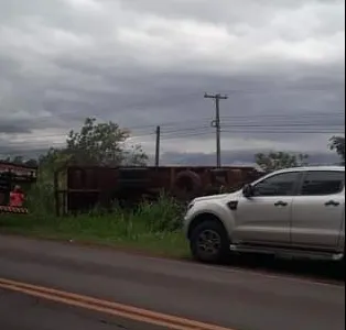 Caminhão carregado de madeira tomba na rodovia entre Arapongas e Sabáudia