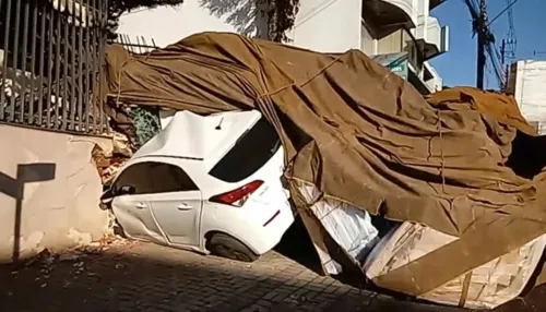 De acordo com o caminhoneiro, ele estava reduzindo a velocidade do veículo quando escutou um estouro. Com isso, o veículo acabou descendo de ré a Avenida Brasil, atingindo uma caçamba de lixo e dois carros que estavam estacionados. Por fim, bateu no muro de um prédio.
