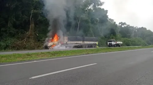 Neste domingo (12), um caminhão bitrem pegou fogo por volta das 16h e parou o trânsito na BR-277 em Morretes, no litoral do Paraná. De acordo com a Polícia Rodoviária Federal (PRF), o episódio foi o quilômetro 23, no sentido praias.