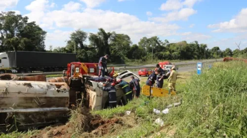 O tombamento de um caminhão carregado com óleo vegetal deixou uma pessoa gravemente ferida, no início da tarde desta sexta-feira (6), no km 450 da BR-376, próximo de Tibagi, região dos Campos Gerais. Equipes de socorro do Corpo de Bombeiros foram deslocadas ao local do acidente com apoio do médico do Samu.