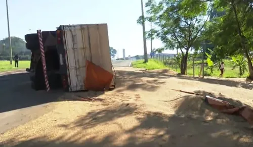 Durante a manhã desta terça (9), um caminhão tombou em uma alça de acesso à BR-369, entre as cidades de Cambé e Londrina. Com o acidente, a carga de soja do veículo acabou espalhada sobre a pista e também invadiu a entrada de um sítio no local.