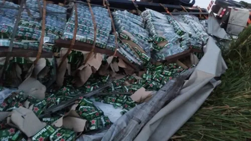 Uma carreta carregada com centenas de garrafas de cerveja tombou na BR-376 entre Marialva e Mandaguari, na manhã desta quinta-feira (28), véspera de feriado santo.