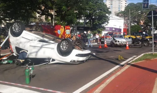Carro capota após bater em outro veículo no centro de Maringá