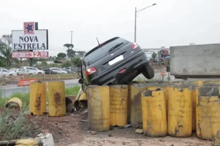 Carro “decola” e fica suspenso em manilhas de obras